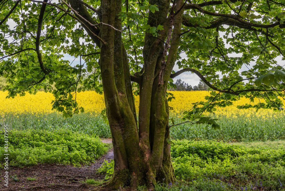 Beautiful moody agricultural canola rapeseed field in English countryside landscape on Spring morning