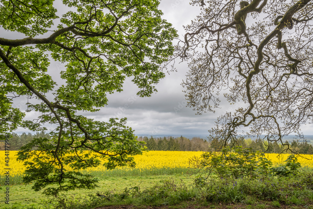 Beautiful moody agricultural canola rapeseed field in English countryside landscape on Spring morning