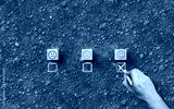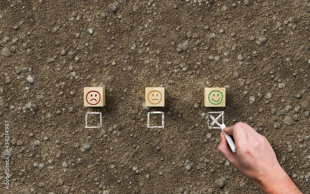 hand selecting a happy emoticon symbolizing a very good review on dirt gravel background