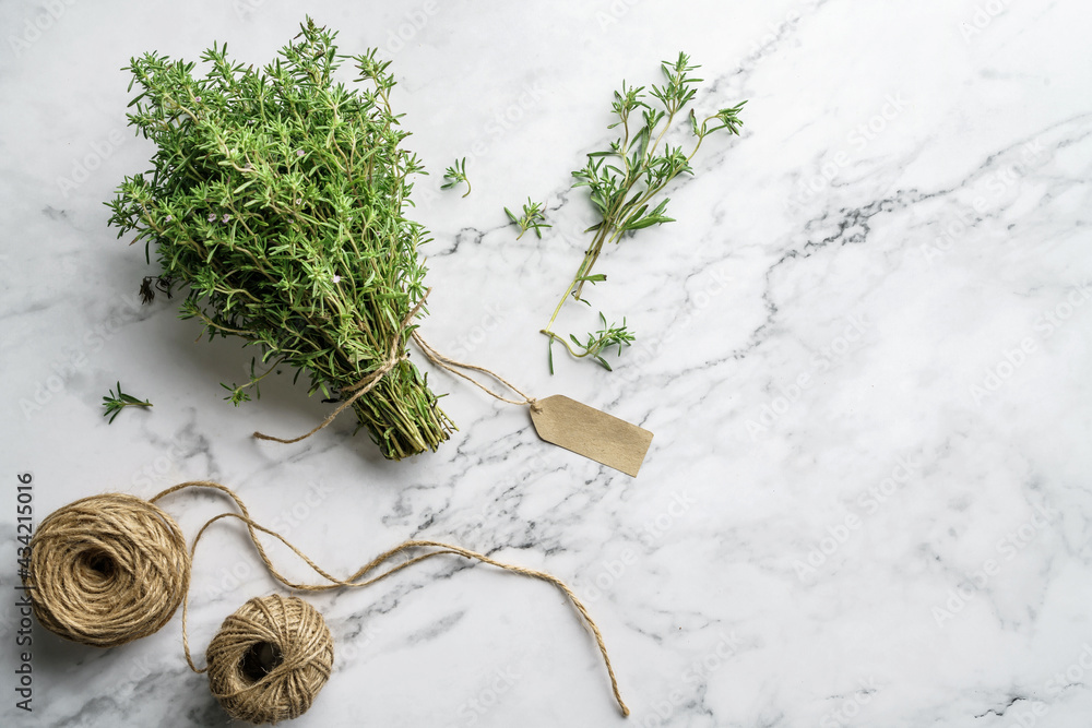 Thyme herb bunch. Bouquet of fresh thymes on light marble background with skein of jute twine. Top view