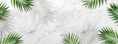 Tropical leaves, Palm plants on light marble background. Summer concept, flat lay, top view