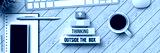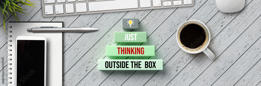 boxes with text JUST THINKING OUTSIDE THE BOX and computer equipment on wooden background
