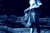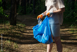 A volunteer and eco activist collects garbage in bags, in the forest, close-up. Recycling of plastic waste, environmental protection. Protecting the planet from debris. Ecology concept
