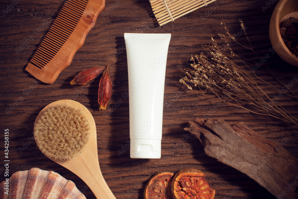 mockup of beauty fashion cosmetic makeup bottle lotion product with skincare healthcare concept on wood background
