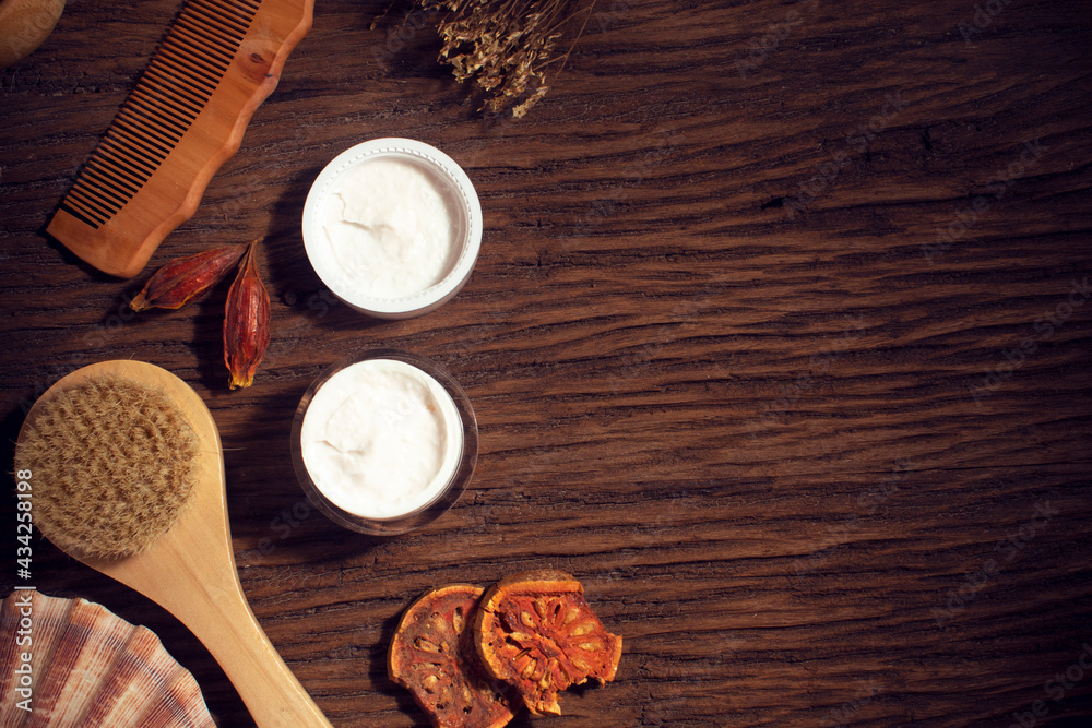 mockup of beauty fashion cosmetic makeup bottle lotion product with skincare healthcare concept on wood background