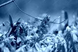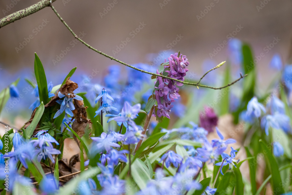 Blooming pretty lawn of blue Scilla bifolia (alpine squill) and purple Corydalis cava close-up. Sunny spring flowers with dry leaves and selective focus blur