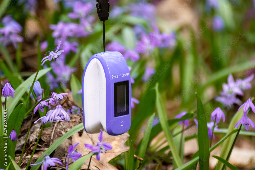 Pulse oximeter outdoors close-up with spring purple scilla flowers background. Blue oxygen saturation meter (SPO2) with empty screen and selective focus blur. Space for copy text