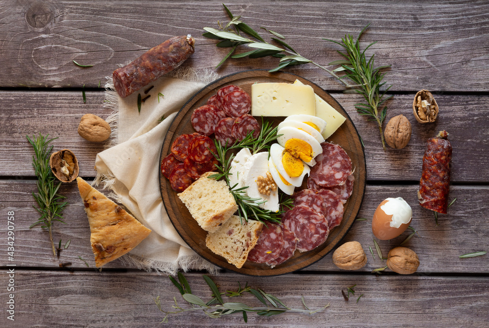 typical Neapolitan dish of the Easter period withsalami ricotta salata, tortano, casatiello, provolone and hard-boiled eggs