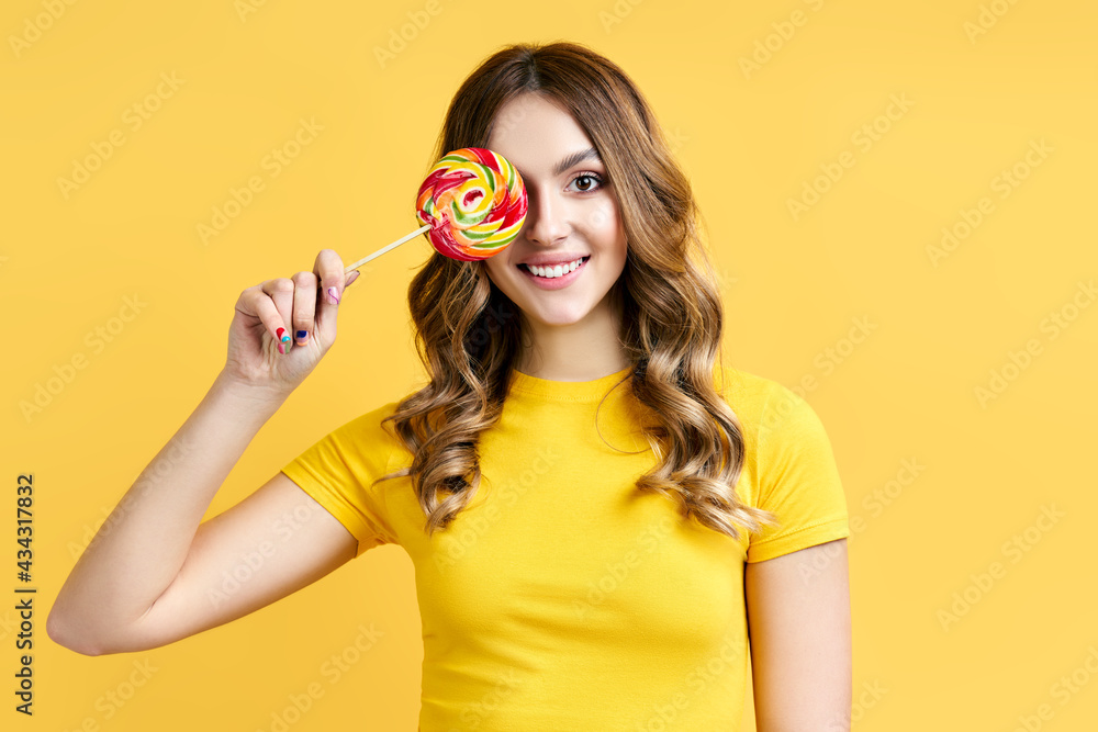 Pretty smiling woman covers her eye with colorful lollipop isolated on yellow background.