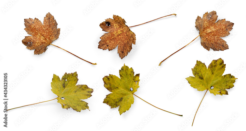 A collection of dry autumn Sycamore Tree leaves isolated against a white background. High Resolution.