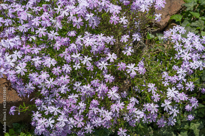 Nature background of purple creeping phlox, moss phlox or mountain phlox. Blooming phlox in the spring garden, top view close-up. Rockery with a small pretty purple flower.