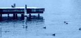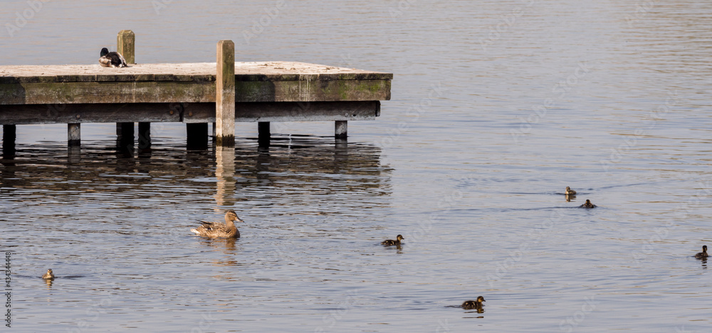Mallard duck family with ducklings swiming on Pickmere Lake, Pickmere, Knutsford, Cheshire