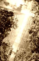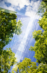 green city - double exposure of lush green forest and modern skyscrapers windows.