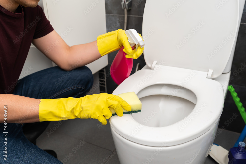man cleaning toilet bowl in bathroom
