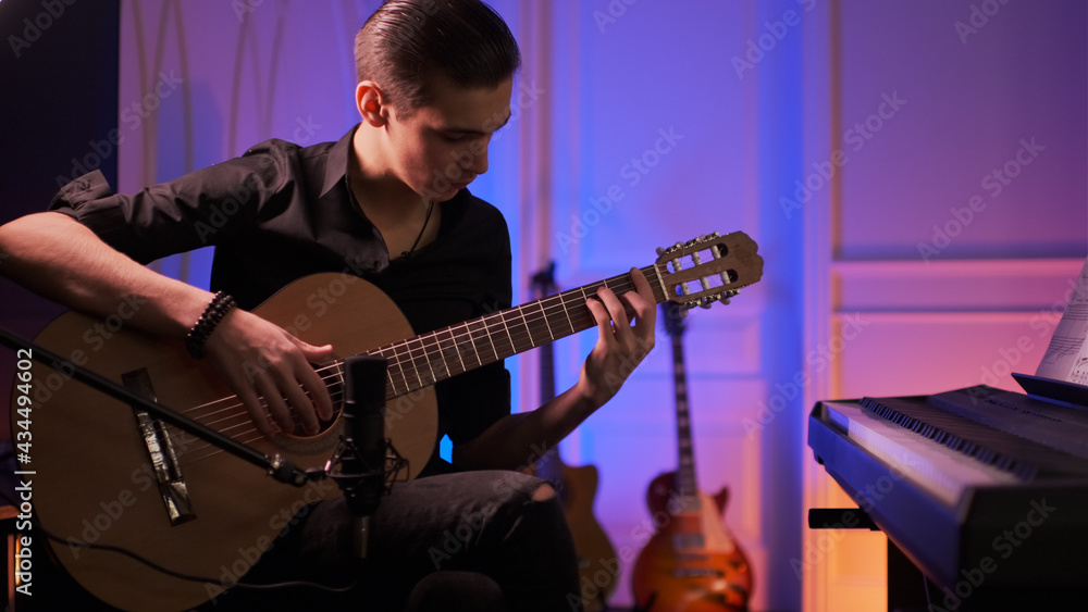 Man plays guitar. Young man plays a musical instrument. Musician records his composition in a music Studio using professional microphone