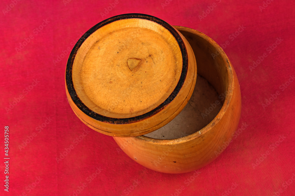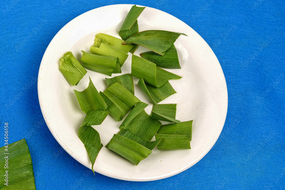 Green onion leaf slices on a ceramic plate on a blue background close-up