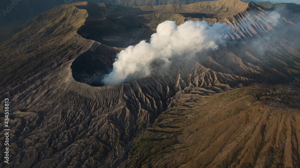 Smoke out of crater of volcano in Indonesia. High angle view of Mount Bromo as active volcano in East Java, Indonesia.