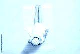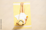 Alone woman in straw hat and dress sitting on yellow beach towel and drinking orange juice. summer. Top, aerial view