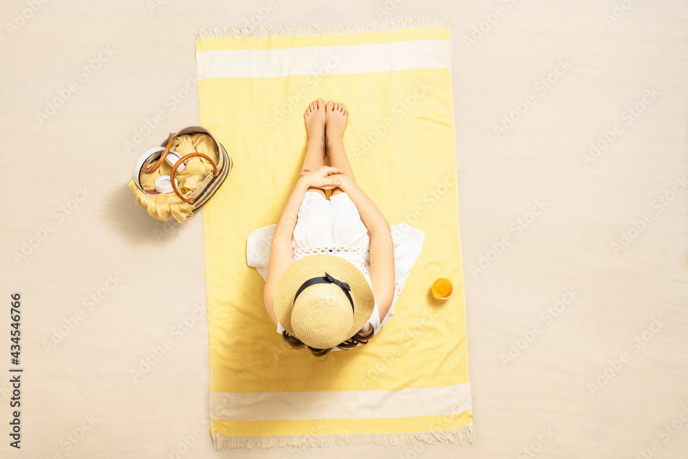 Alone sad woman in straw hat and dress hugging her legs sitting on yellow beach towel. Aerial view