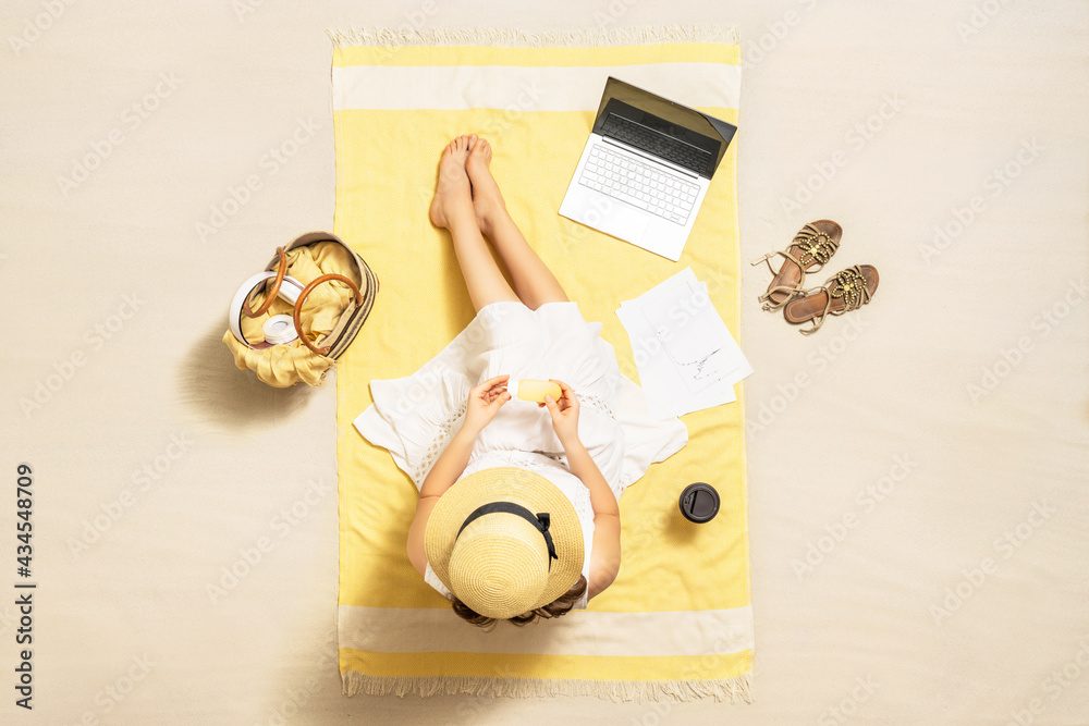 Businesswoman freelancer applying sunscreen on skin sitting on the beach towel of sand beach and working on laptop with graphics and charts. Summer. Top view