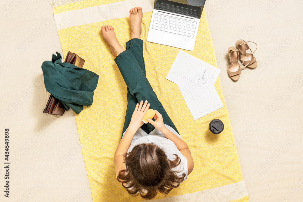 Businesswoman freelancer in office suit applying sunscreen on skin sitting on the beach towel of sand beach and working on laptop. lunch break. Aerial view