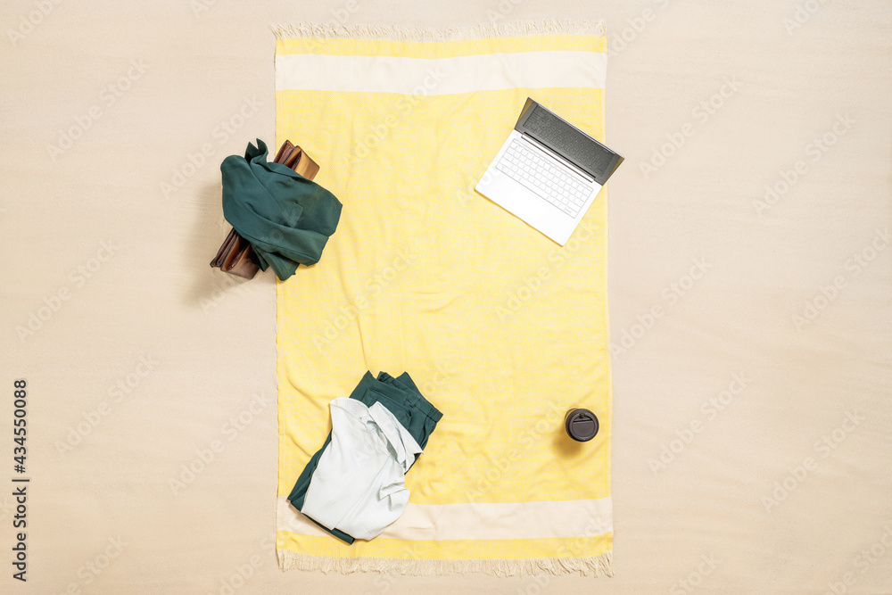 Woman office suit, office briefcase, laptop and coffee on the beach towel of sand beach. lunch break. Aerial view. Concept