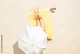 Alone woman in bikini sitting and sunbathes on yellow beach towel. under umbrella. Female relaxation on the sand beach at summer vacation. Top, aerial view