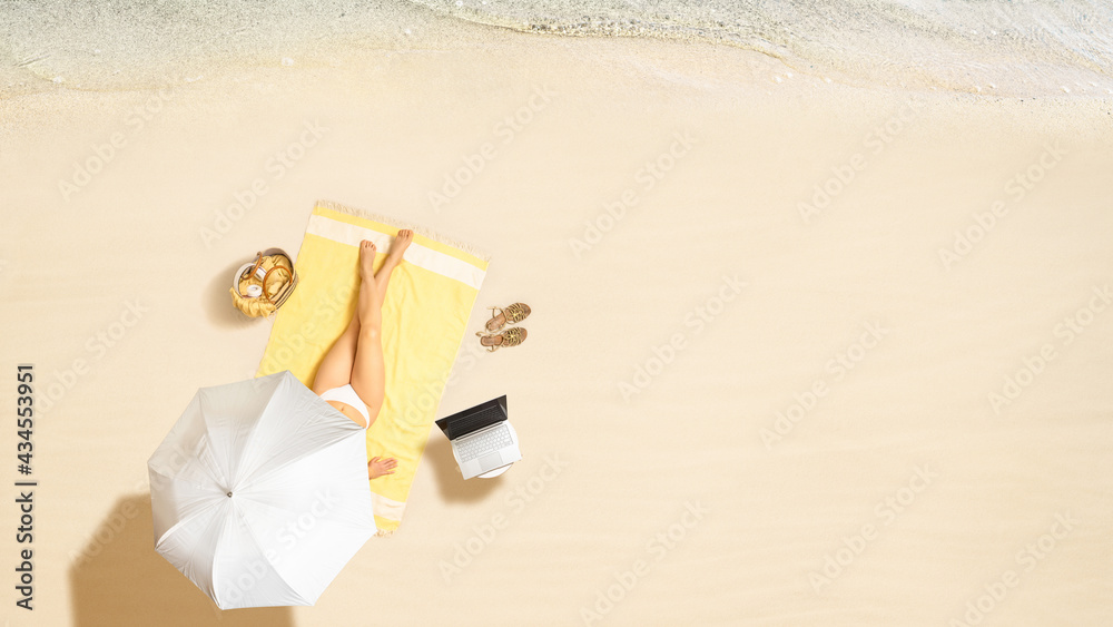 Woman in bikini with laptop, bag, headphones sitting on the beach towel near sea coastline under umbrella. Summer vacation. Aerial view.16:9