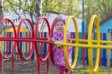 A little beautiful girl in a pink jacket does sports on the sports field in the spring