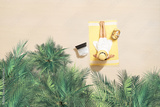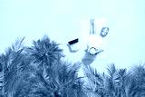Woman with laptop, bag and headphones sitting on the beach towel and enjoying summer vacation under palm trees branches. Aerial view