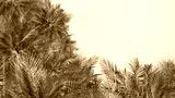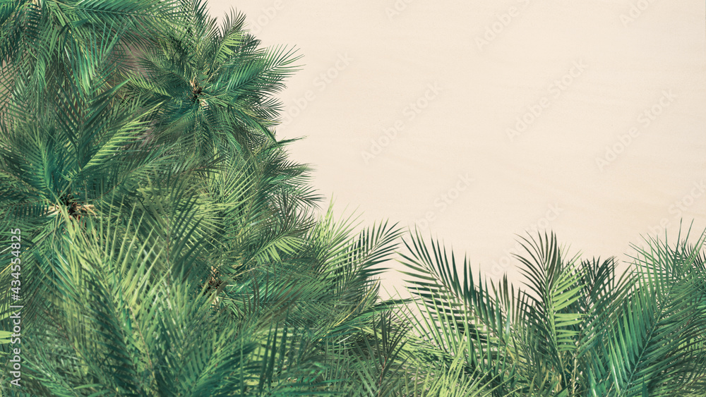 Top and aerial view on tropical sand beach, palm tree. Copy space. Drone photo. 16:9. Background