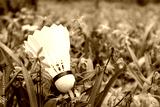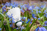 Badminton white feather shuttlecock close-up in spring blue scilla flowers lawn. Play sports activity outdoors on fresh air.