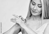 Mature beautiful senior mid age older Asian woman of 50s years applying putting skin care lotion hand cream doing her everyday routine. Antiaging beauty skin face body care concept.
