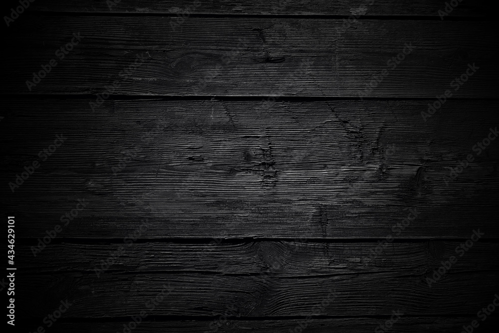 Black background. Vintage wood background in black color with vignette. Old wood texture with cracks, scratches, dents. Monochrome photo.