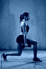 Side full length portrait of female bodybuilder training legs using dumbbells. Muscular sportswoman with perfect body doing lunges indoors, loft interior. Concept of bodybuilding, healthy lifestyle.