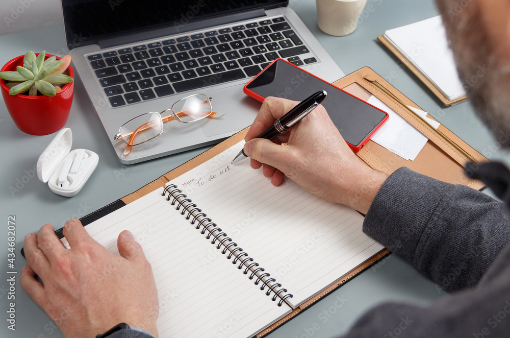Man writing in agenda TO DO LIST near laptop on a grey office desk close up