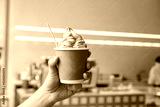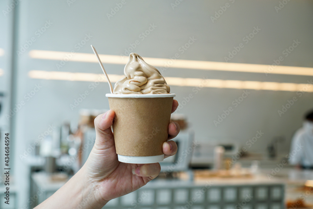 Hand holding a coffee soft serve ice cream. A paper cup of ice cream with coffee flavour, ice cream made of arabica coffee bean at coffee cafe.