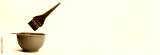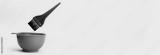 brush levitating over a plastic bowl of hair dye. Copy space for text. Horizontal banner