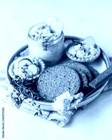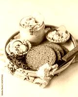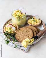 Plate with tartlets, multigrain crackers with egg pate or salad served with radish and thyme.