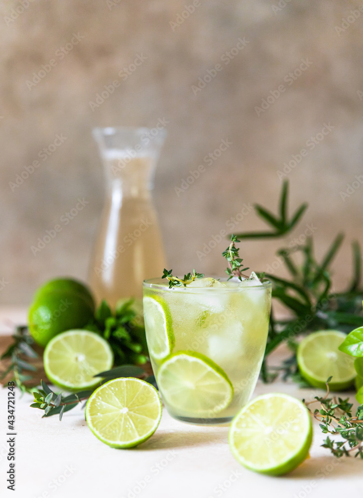 Cold refreshing summer drink or lemonade with lime and thyme on concrete background.