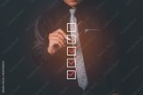 Concept of customer satisfaction assessment experience Man's hand showing excellent score on check mark, copy space background.