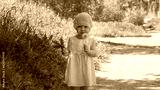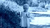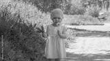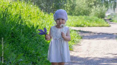 Cute baby girl in white dress and panama hat blowing on a dandelion in summer