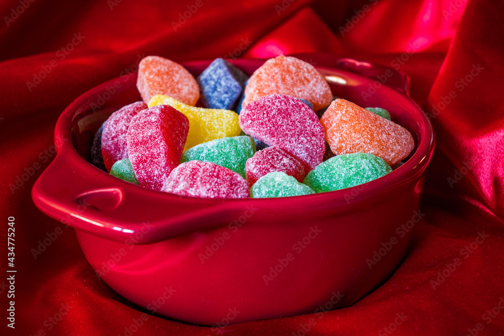 candy in a red ceramic bowl satin background
