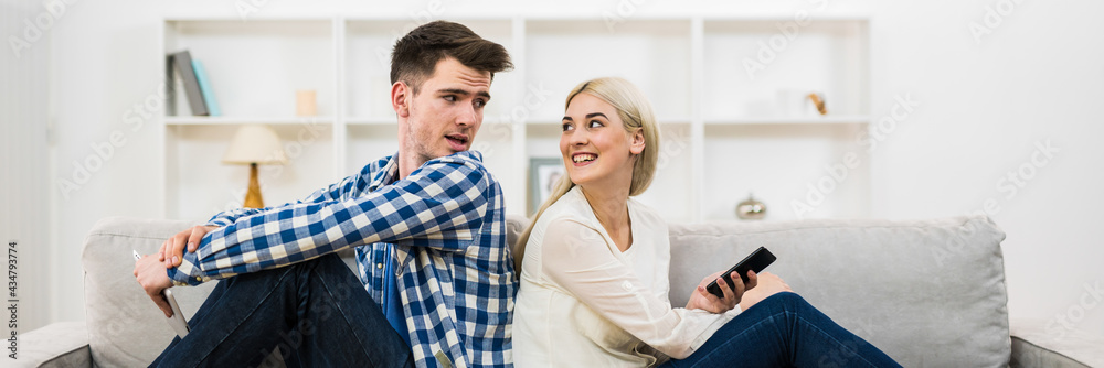 The happy man and woman with a phone and a tablet sit on the sofa