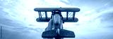 The hand launch a wooden plane on the blue sky background