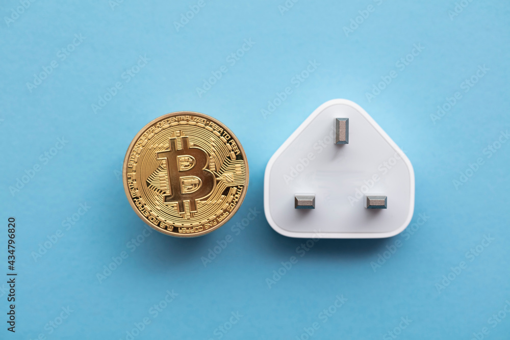 bitcoin cryptocurrency energy consumption concept. Gold coin with electric plug