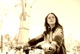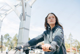 Teenager girl on a city bike. Portrait of a beautiful girl. Sunny summer weather. Casual blue hoody. Lifestyle people close up enjoying summer. Bicycle steer in a foreground