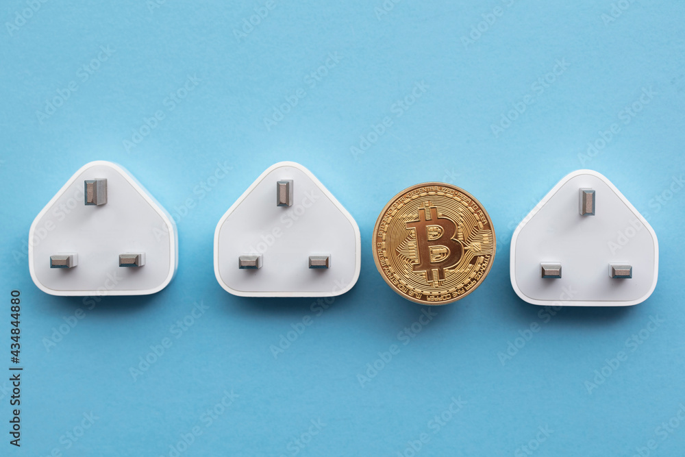 bitcoin cryptocurrency energy consumption concept. Gold coin with electric plug
