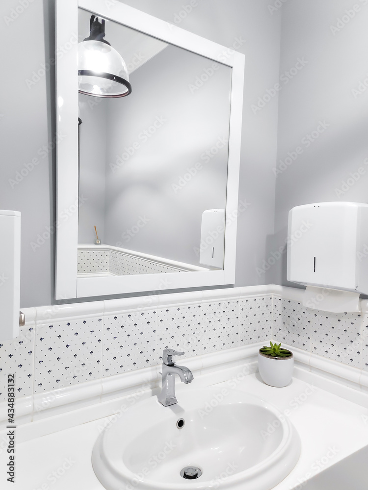Modern white clean bathroom with big mirror and sink, luxury home interior
