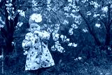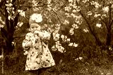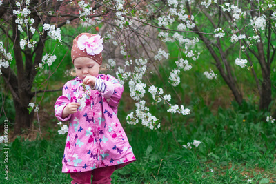 A 2-year-old girl in a pink jacket and a hat with a pink flower holds a branch of a cherry blossom in her hand against the background of a tree with white flowers